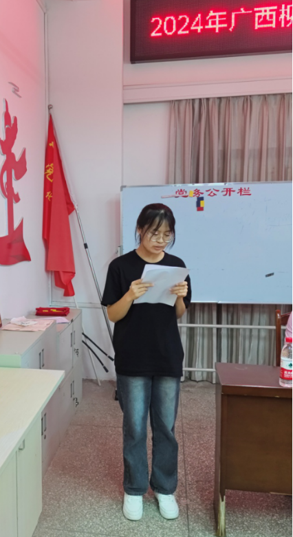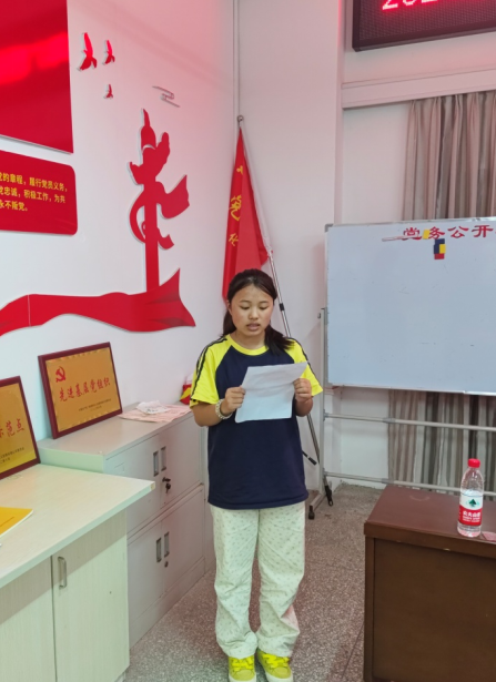 新团员代表覃译娇同学在发言中表达了自己的激动之情,她首先向团组织表达了深深的敬意和感激,并代表所有新团员郑重承诺,将牢记自己的责任和使命,勇于面对挑战和困难,始终保持积极向上的态度,不断追求进步和成长,用实际行动践行共青团员的誓言,为团组织的发展和社会的进步贡献自己的力量,共同书写新时代的青春篇章。