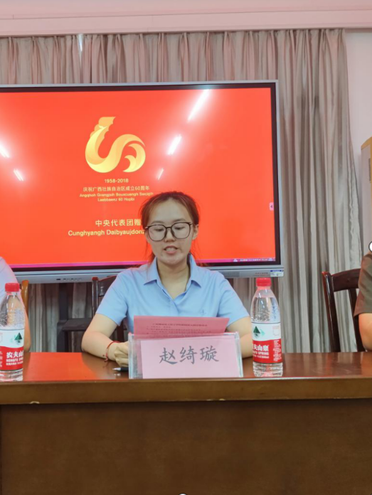 老团员代表韦莲英同学勉励新团员们要时刻牢记自己是一名共青团员,按照团员的标准严格要求自己,珍惜时光,勤奋学习,不断进取,努力提升自己的综合素质和能力,为实现自己的入团誓言而努力奋斗。