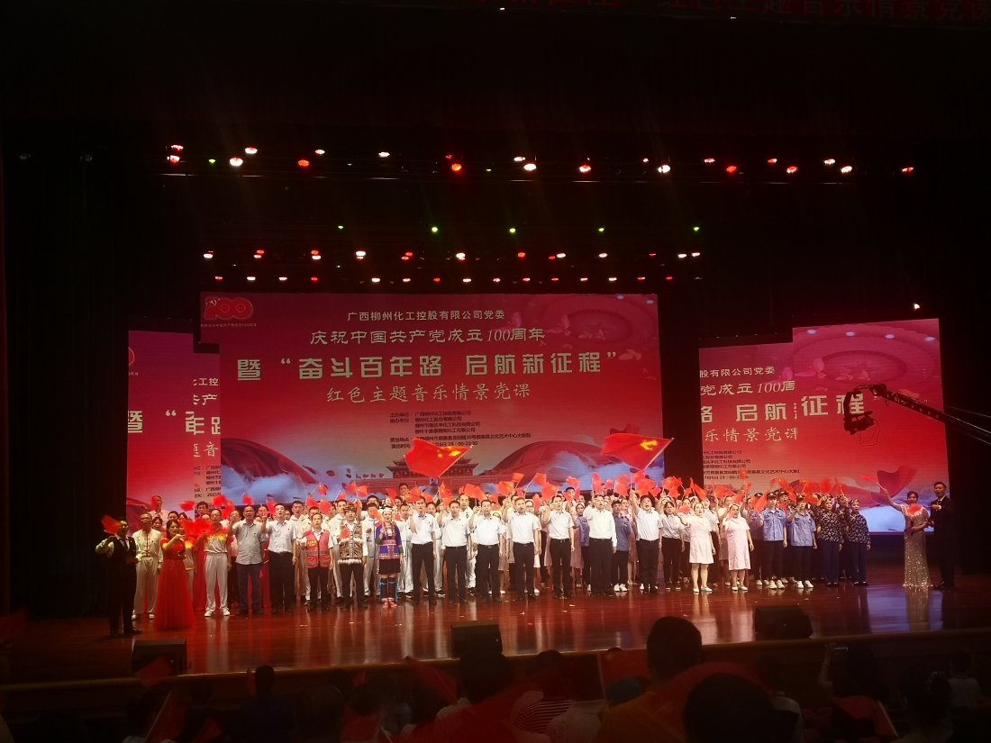 7月6日晚,广西柳州化工控股有限公司党委庆祝中国共产党成立100周年暨“奋斗百年路,启航新征程”红色主题音乐情景党课在鹿寨县文化艺术中心大剧院隆重举行,广大党员干部和职工群众一同重温中国共产党的百年光辉历程,一同讴歌中国共产党的百年丰功伟绩,共同展望更加美好的未来。党课形式多样、内容丰富,共分“忆峥嵘岁月”、“建设新中国”、“走进新时代”、“启航新征程”四个篇章。由我校党支部选送节目歌伴舞《把一切献给党》和手语《感恩的心》获得了热烈的掌声。