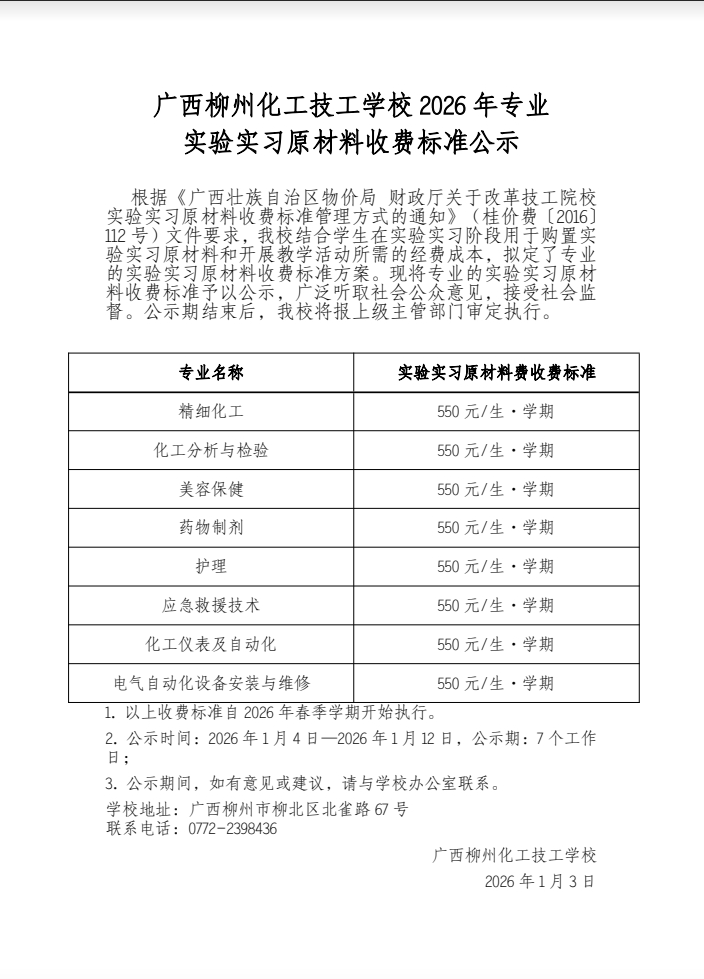 广西柳州化工技工学校2026年专业 实验实习原材料收费标准公示